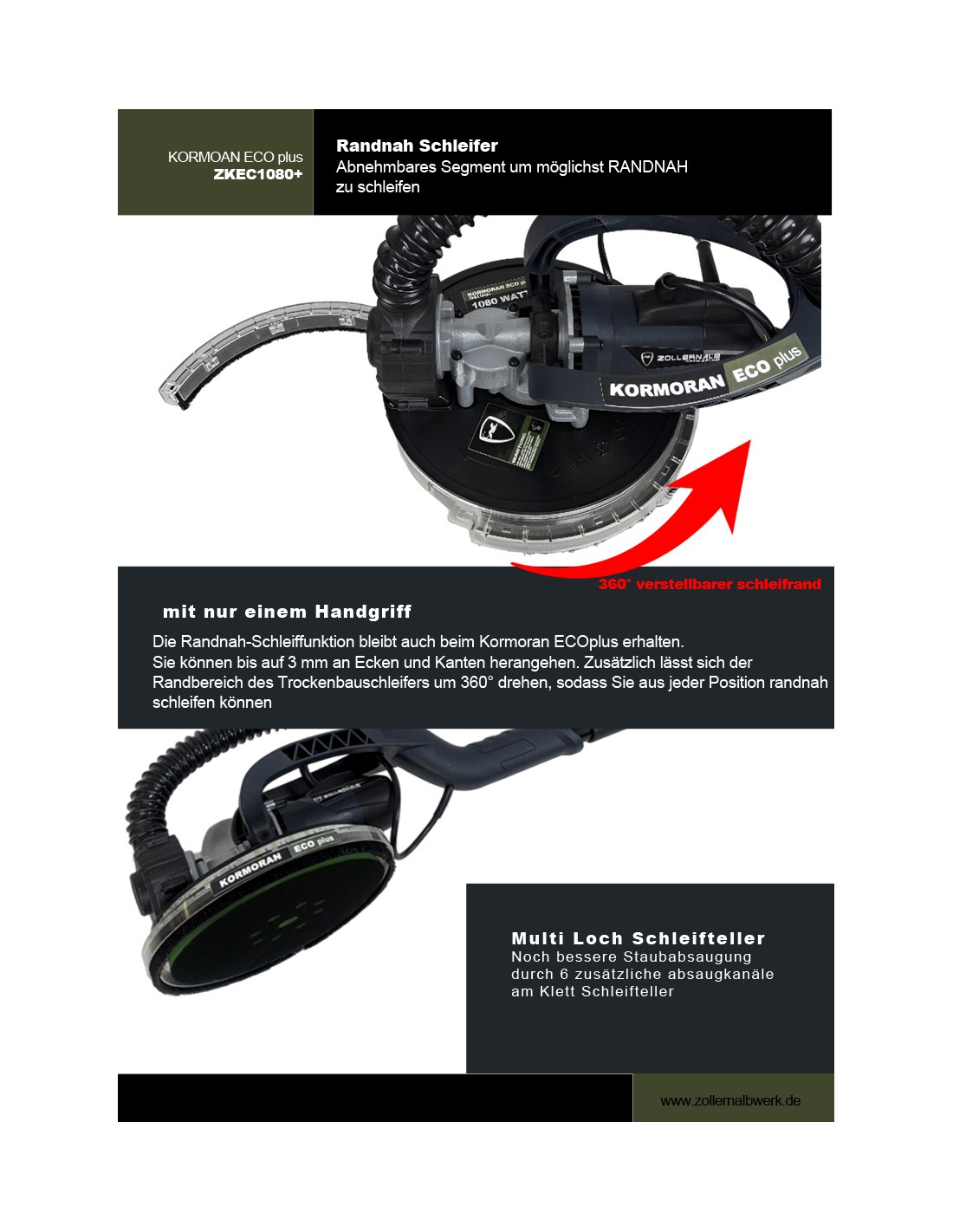 Die Randnah-Schleiffunktion bleibt auch beim Kormoran ECOplus erhalten. Sie können bis auf 3 mm an Ecken und Kanten herangehen. Zusätzlich lässt sich der Randbereich des Trockenbauschleifers um 360° drehen, sodass Sie aus jeder Position randnah schleifen können. Der Zollernalb Schleifteller ist mit einer Multilochung ausgestattet und verstärkt somit die bereits hochwirksame integrierte Absaugung.