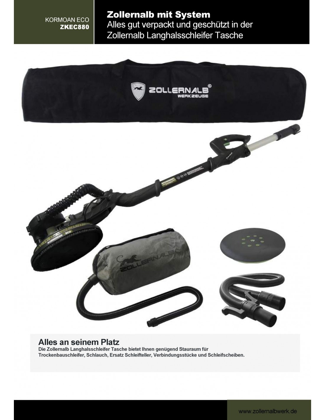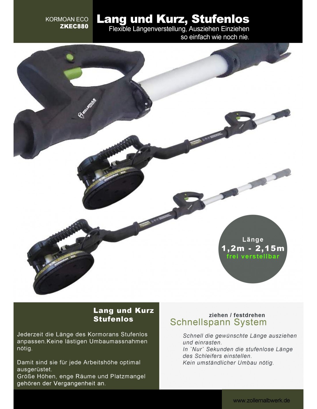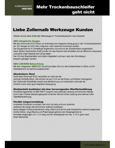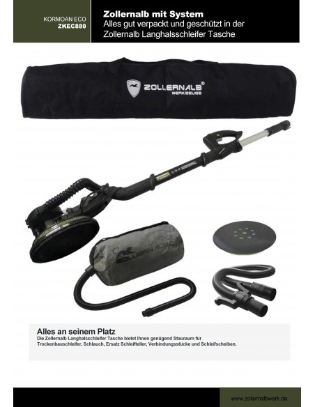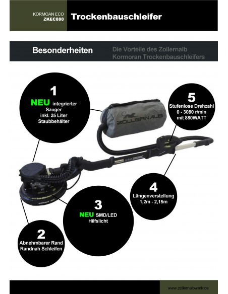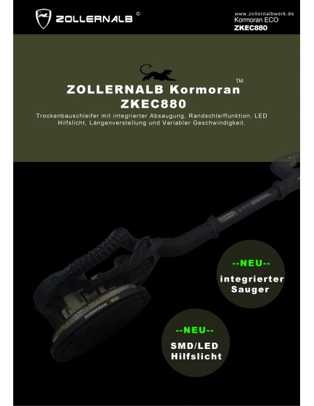 Zollernalb Tools stabilisce ancora una volta nuovi standard nel settore del cartongesso. Alla regolazione brevettata della lunghezza si aggiunge l'aspirazione diretta brevettata. La levigatrice a collo lungo Kormoran ECO offre tutti i vantaggi della famiglia di levigatrici a collo lungo Zollernalb in un unico dispositivo. Nonostante queste funzioni aggiuntive, la nuova Kormoran ECO pesa solo 3,8 kg ed è completamente nella tradizione delle leggere levigatrici a collo lungo Zollernalb .