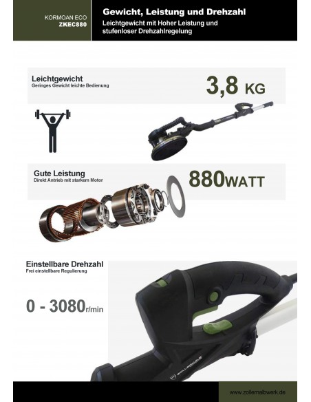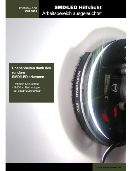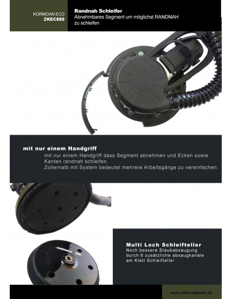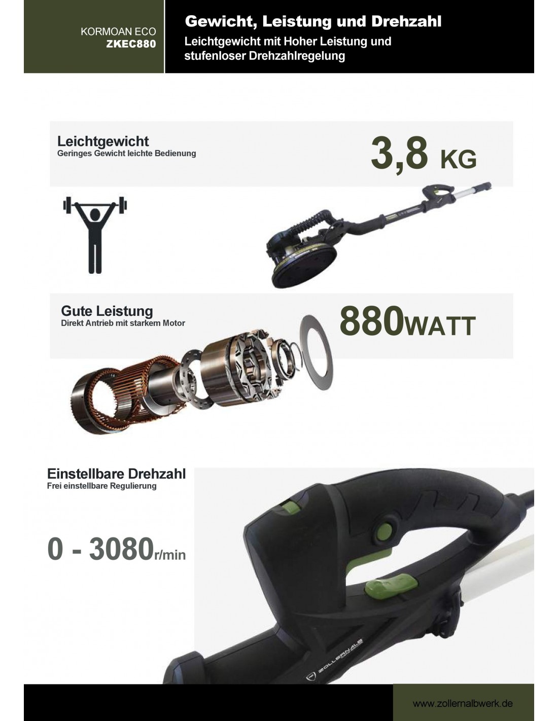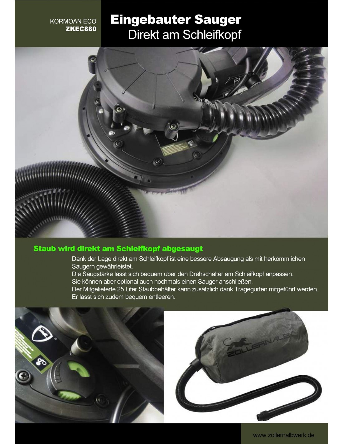 Zollernalb Tools stabilisce ancora una volta nuovi standard nel settore del cartongesso. Alla regolazione brevettata della lunghezza si aggiunge l'aspirazione diretta brevettata. La levigatrice a collo lungo Kormoran ECO offre tutti i vantaggi della famiglia di levigatrici a collo lungo Zollernalb in un unico dispositivo. Nonostante queste funzioni aggiuntive, la nuova Kormoran ECO pesa solo 3,8 kg ed è completamente nella tradizione delle leggere levigatrici a collo lungo Zollernalb .