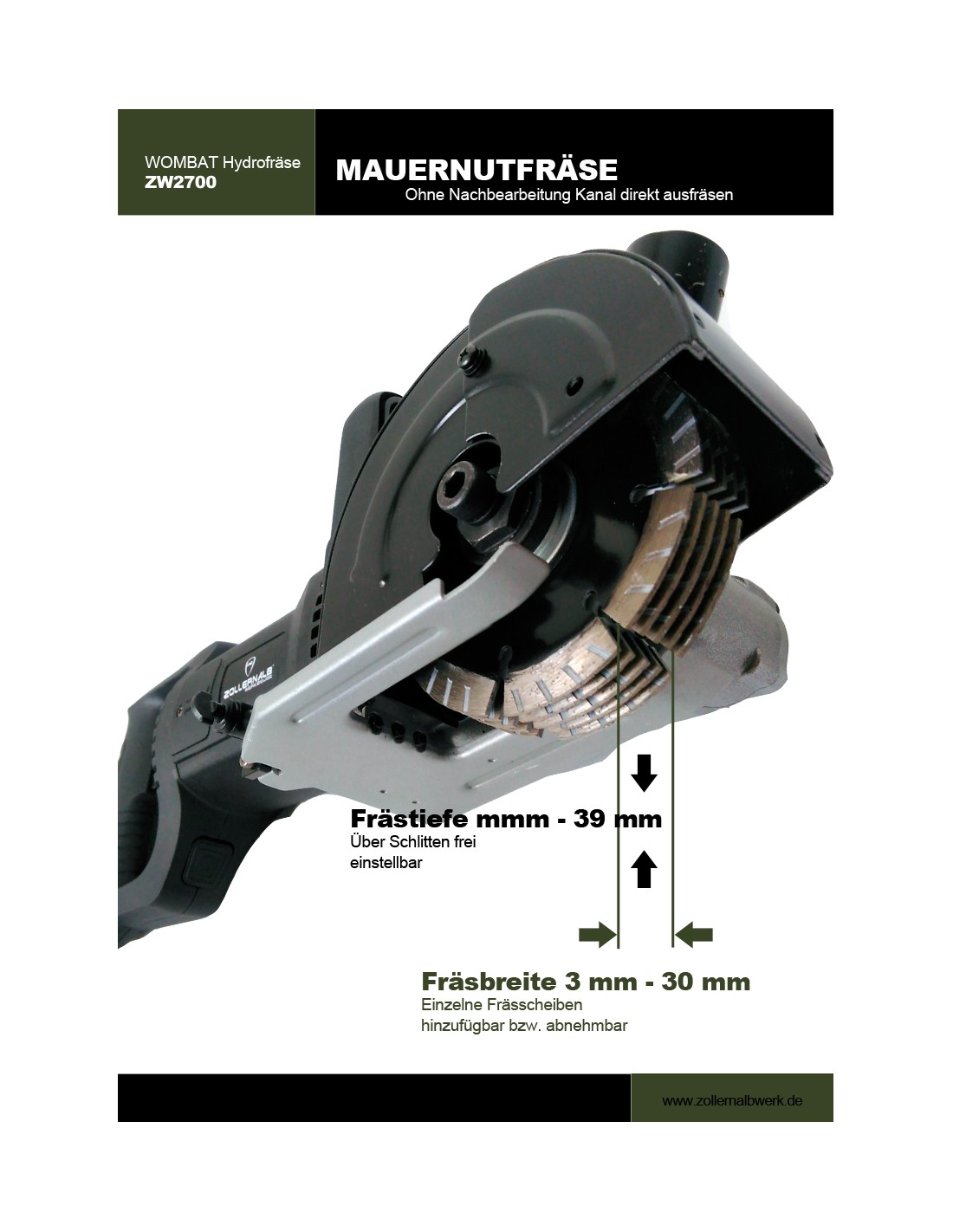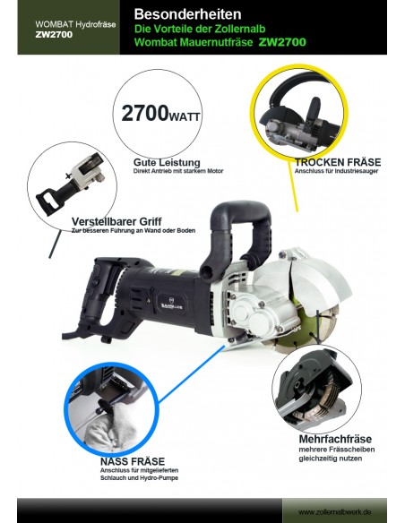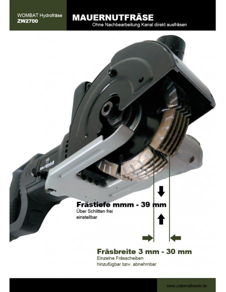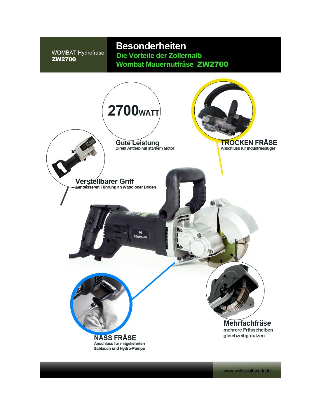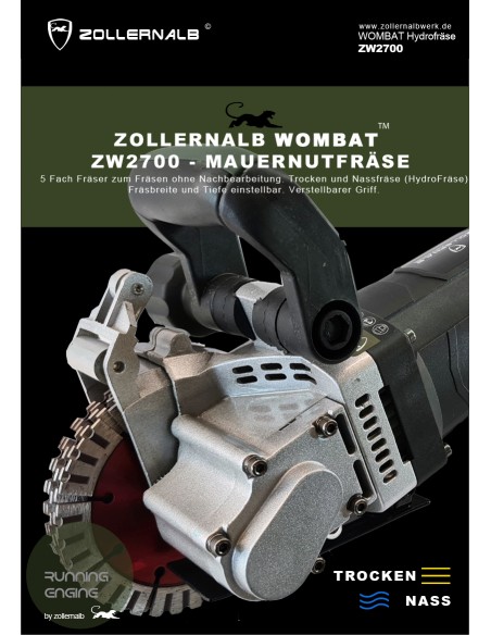 Zollernalb WOMBAT ZW2700 veggjager, også kjent som veggjager eller veggspalter, er et spesialverktøy som brukes til å lage skjøter for rør eller kabler i mur som kalkstein, gipsblokker, Ytong eller porebetong, murverk og murstein